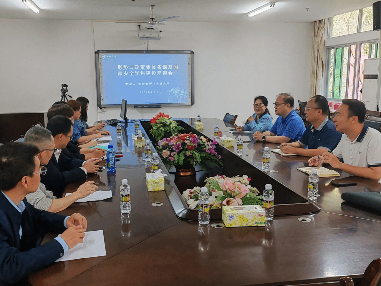 2025年4月15日上午,伟德国际bevictor1946在社科楼A311举行集体备课会。特邀吉林大学国家发展与安全研究院副经理郭锐教授围绕国家安全团队建设进行专题指导。座谈会由“形势与政策”教研室主任彭兴智副教授主持,公司副经理王善教授、政治学责任教授姜秀敏分别发表关于团队建设的讲话,“形势与政策”教研室全体成员参会。