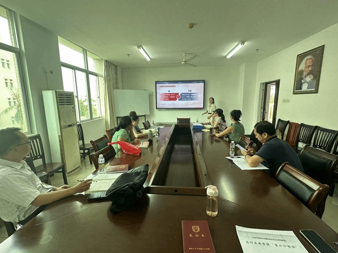 习近平新时代中国特色社会主义思想概论教研室于5月14日上午9点在社科楼A308开展集体备课会。会议由教研室主任刘涵老师主持,胡丹老师主讲,教研室老师共同研讨。
