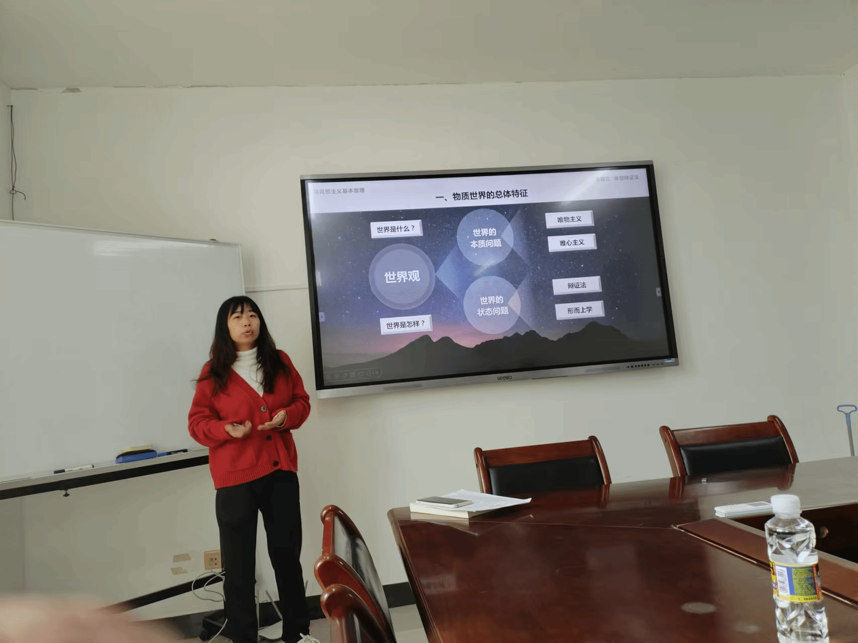 会议第一阶段,主讲人授课。孙小杰老师用了45分钟讲授了教材第一章第二节事物的普遍联系和变化发展。孙老师首先强调辩证唯物主义世界观不仅需要了解世界是什么的问题,还需要进一步理解世界怎么样的问题,由此导出唯物辩证法。其次将讲授内容设计为两种不同的思维方法、事物的普遍联系、事物的变化发展三个方面的问题,全面阐述分析唯物辩证法的总体特征。