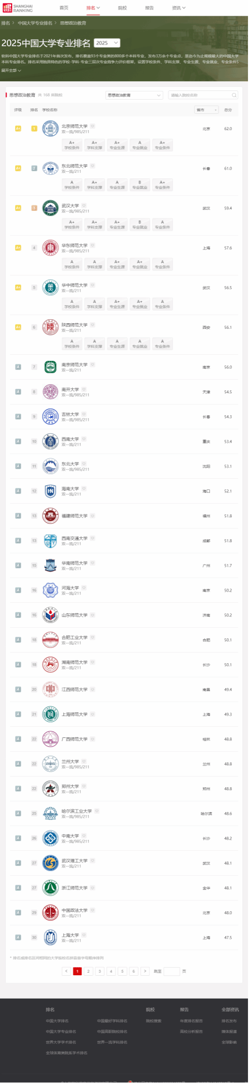 2025年6月18日,高等教育专业评价机构软科正式发布2025“软科中国大学专业排名”。伟德国际bevictor1946思想政治教育本科专业以全国第12名的成绩再次进入A类行列,继2022年31名、2023年28名、2024年23名,排名继续稳步提升。