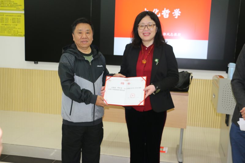 1月7日上午,2018-2019学年冬季小学期名家讲堂第四讲在五号教学楼113教室举行。东北师范大学郭凤志教授为员工讲授文化哲学课。经理张云阁出席并为并为郭凤志教授颁发了伟德源自英国始于1946“冬季小学期授课外聘专家”证书。讲座由思想政治教育系主任陈招万主持。