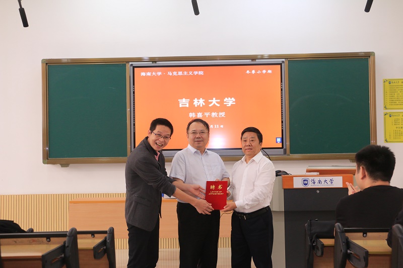 1月11日至1月12日,2019-2020学年冬季小学期名家讲堂第七讲在5号教学楼112教室举行。吉林大学韩喜平教授应邀就“中国特色社会主义政治经济学”的相关知识为公司同学进行授课。经理张云阁出席并为韩喜平教授颁发伟德源自英国始于1946“冬季小学期授课外聘专家”证书。讲座由思想政治教育系主任陈招万主持。