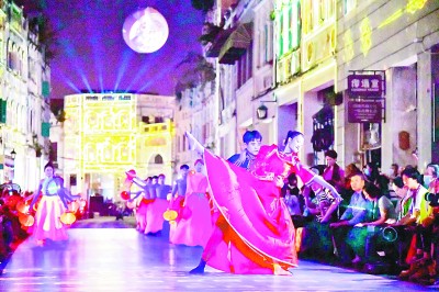 在“2020海南锦·绣世界文化周”上,一场沉浸式数字光影黎锦文化幻景秀在海口骑楼老街上演。海南省旅游和文化广电体育厅供图