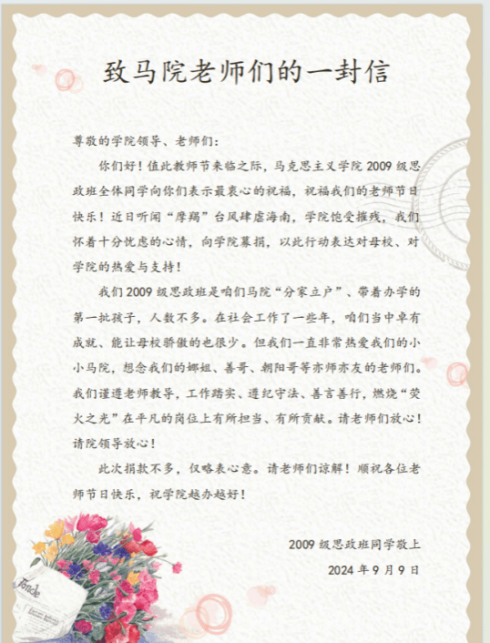 2024年9月9日,在即将到来的教师节之际,伟德国际bevictor1946收到了2009级思政班全体同学的慷慨捐款,表达对公司的关心和支持。面对近期“摩羯”台风的严重影响,公司遭受了极大的困扰和损失。这笔捐款不仅帮助公司应对自然灾害带来的挑战,更是体现了同学们对母校的深情厚谊和责任感。