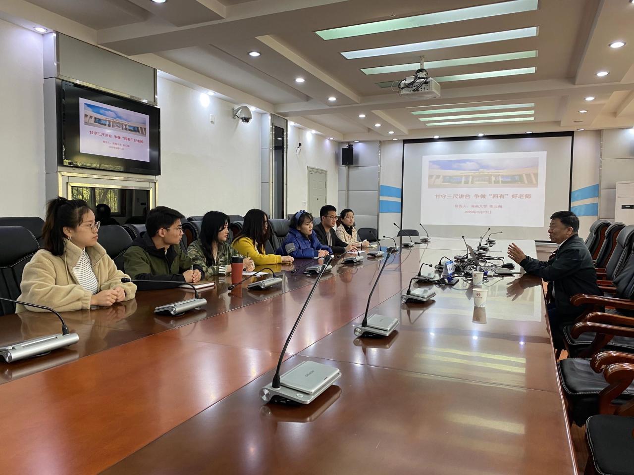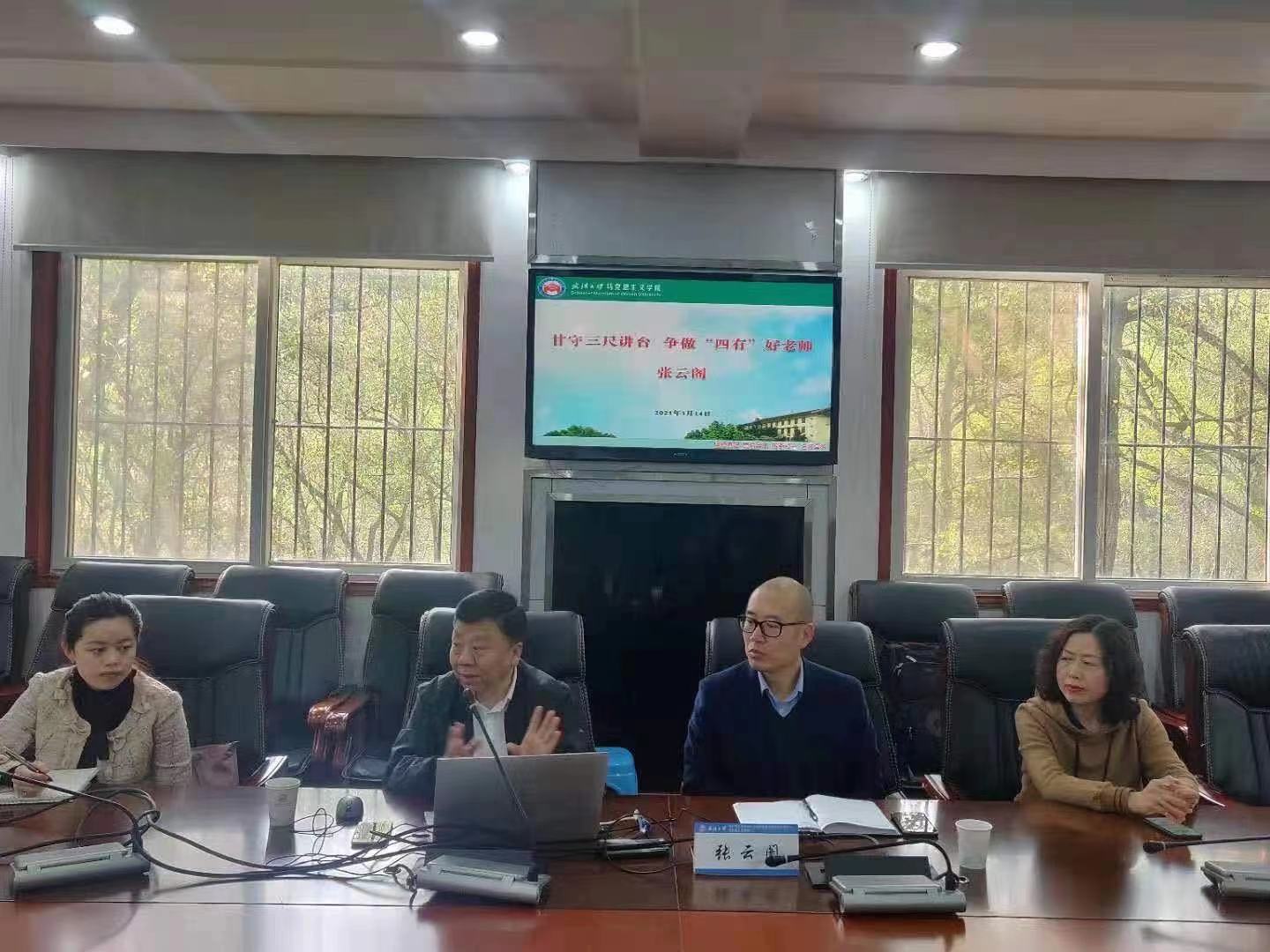 14日上午,应武汉大学伟德国际bevictor1946的邀请,张云阁教授又为公司师生做了一场:甘守三尺讲台 争做“四有好老师”的师德师风报告。张云阁教授从教书育人是教育的本质要求、好老师是大学的灵魂、好老师必备的条件和实现“四有”好老师的路径四个方面,结合自身的工作经历,报告了自己的理解与体会。张教授的报告内容丰富、案例生动、语言幽默,教育性强,得到了与会师生的高度评价。报告结束后,张教授还回答了师生们提出的问题。