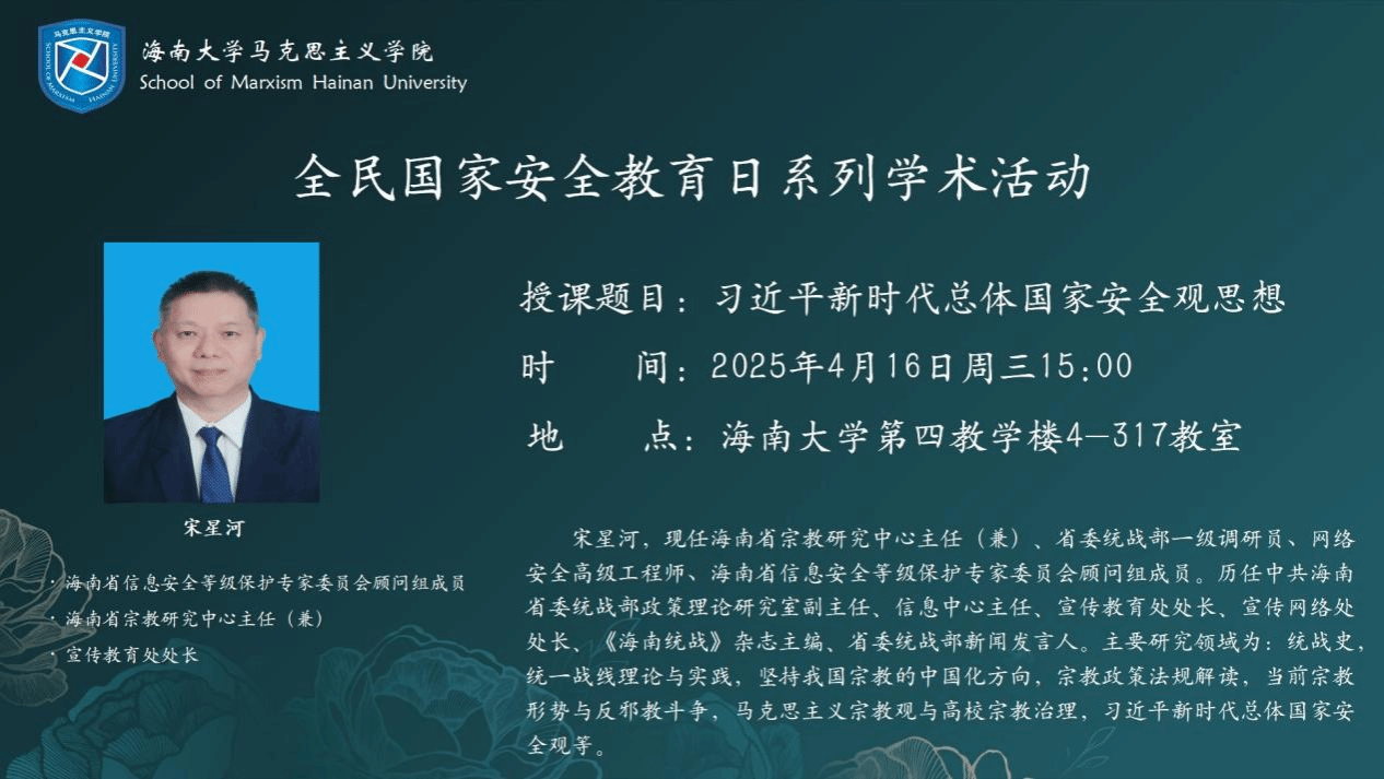 2025年4月16日下午,伟德国际bevictor1946邀请海南省信息安全等级保护专家委员会顾问组成员宋星河,以“习近平新时代总体国家安全观思想”为主题,从历史文化、风险挑战与实践路径三个维度为员工开展讲座。